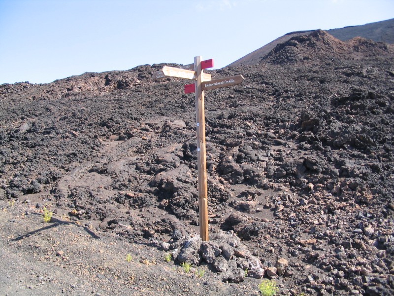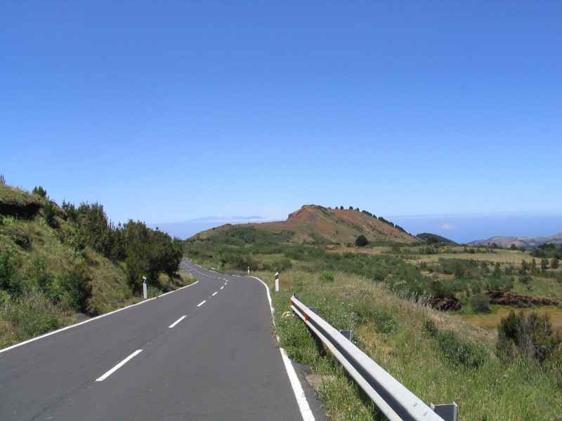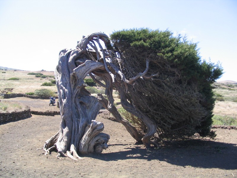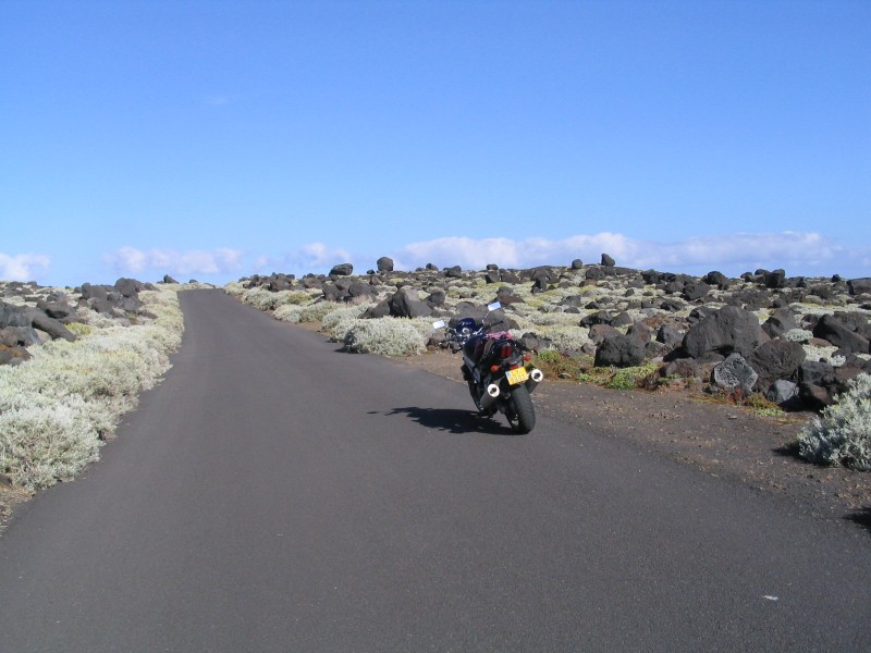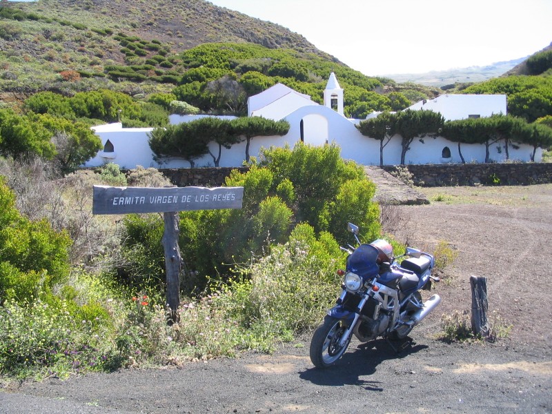Gleich nach dem Frühstück Aufbruch Richtung Süden. Laut Reiseführer soll auch die Hauptstraße ein Stück Schotter sein. Das ist zwar überholt, aber die Nebenstrecken bestehen nur aus Lavaschotter, teilweise mit hübschem Wellblechrelief. Das läßt sich zwar bis zu einer gewissen Steigung fahren, aber weder die SV1000 noch mein Rücken finden es wirklich lustig. Aber die Entschädigung besteht aus einzigartiger Landschaft, der heiligsten Madonna und alten, vom Wind gebogenen Bäumen.