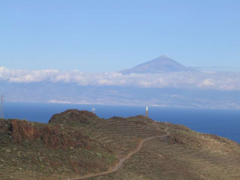 Im Hintergrund sieht man die größere Nachbarinsel Teneriffa mit dem Teide, dessen Spitze immer über den Wolken sichbar ist.