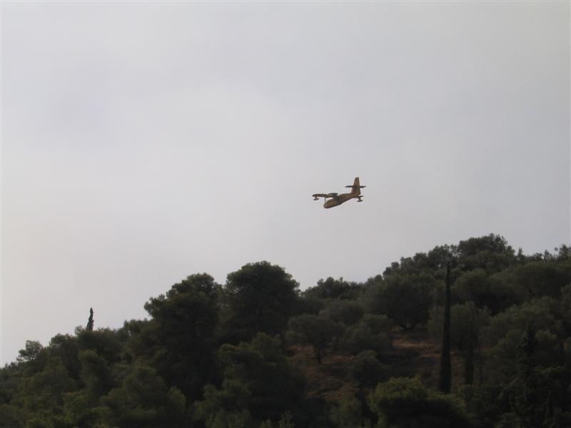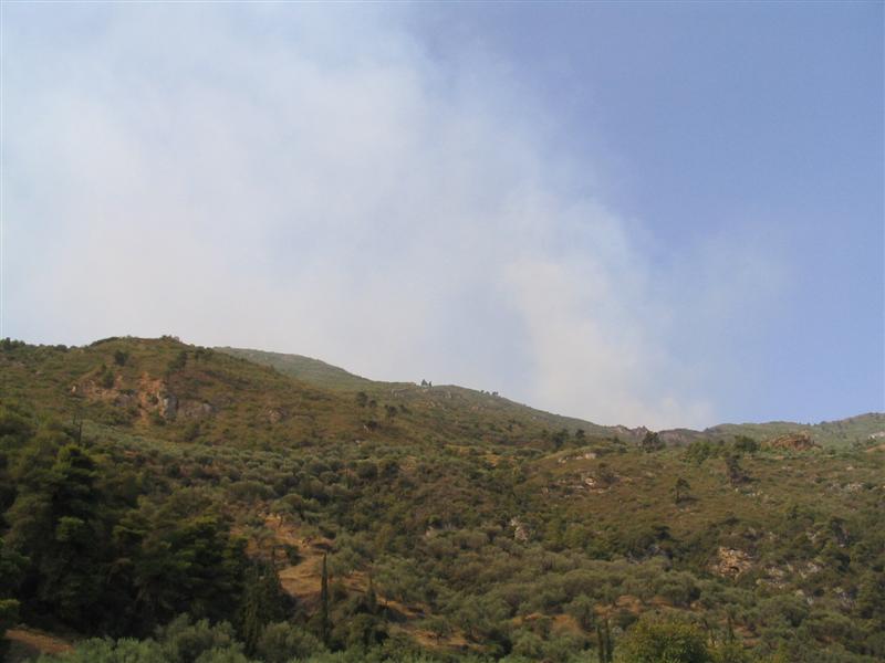 Bei Korinth brennt der Wald. Es riecht nach Rauch, dauernd fliegen Löschflugzeuge zum Wassertanken aufs Meer.